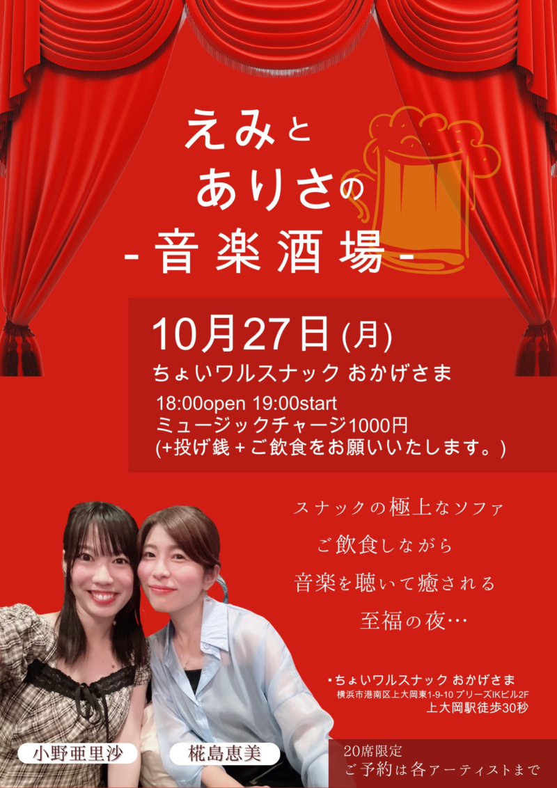 シンガーソングライターとして活躍している椛島恵美さん、小野亜里沙さん、お二人による豪華ピアノコンサートをスナックおかげさまにて開催します。