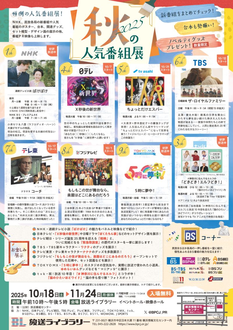 年2回開催している恒例の人気番組展。NHK、民放各局の新番組や人気番組のポスター、台本、関連グッズ、デザイン画などの展示の他、番組PR映像も上映。各局の個性溢れるブースを楽しめます。新番組の台本も勢揃い、各局からのノベルティグッズプレゼント(数量限定、無くなり次第終了)も見逃せません。