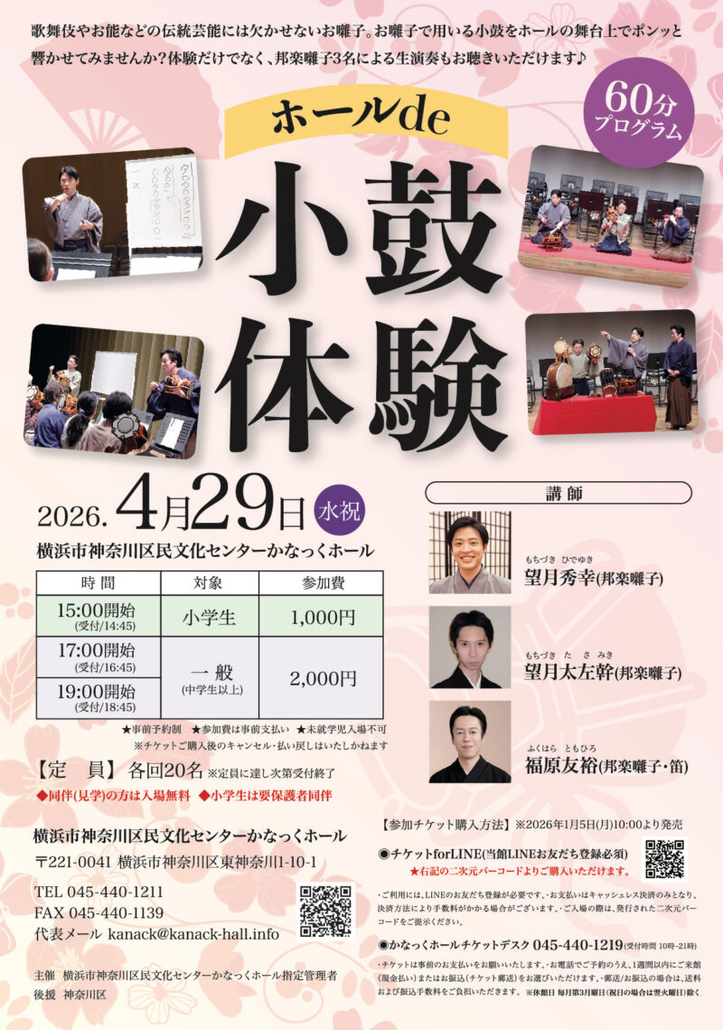 歌舞伎やお能などの伝統芸能には欠かせないお囃子。お囃子で用いる小鼓をホールの舞台上でポンっと響かせてみませんか?邦楽囃子3名による生演奏もお聴きいただけます!2026年度は、小学生回を設けました。各回60分プログラムです。ぜひご参加ください。