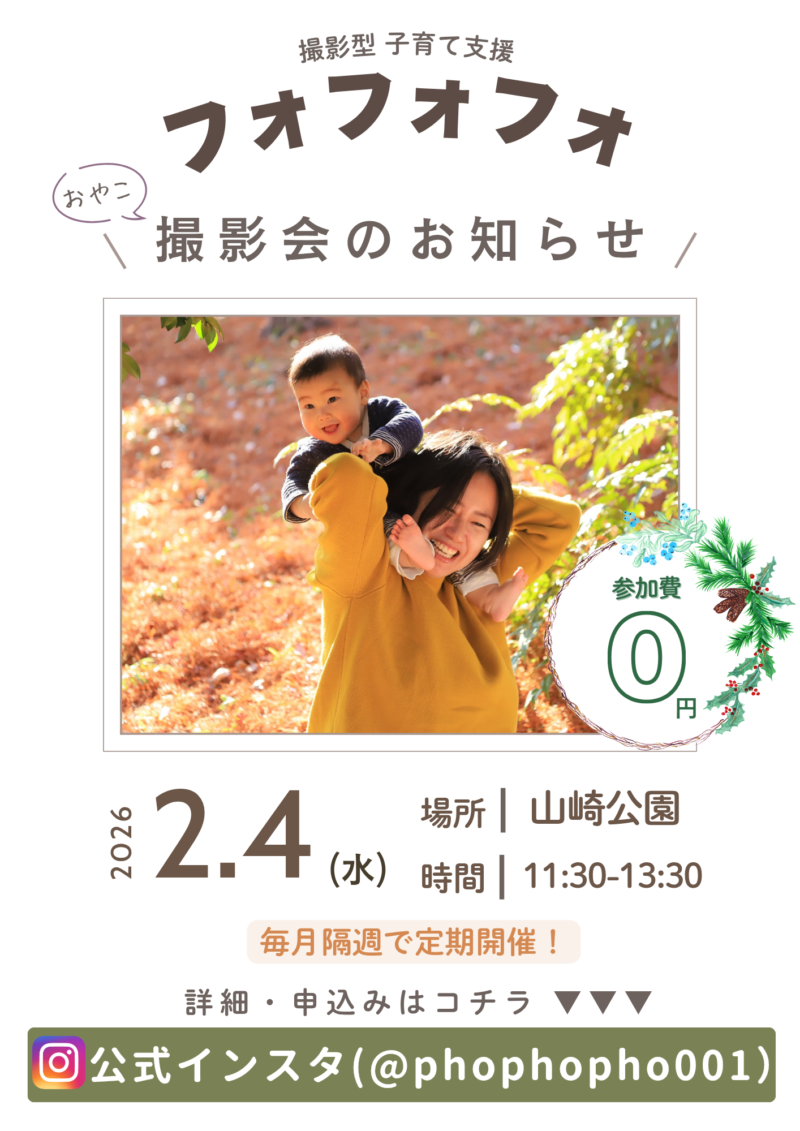 ママパパとお子さん一緒の写真を撮影します「日常を写した子どもといっしょの写真が少ない」といった悩みを解消します。撮影時間は5分〜10分です。