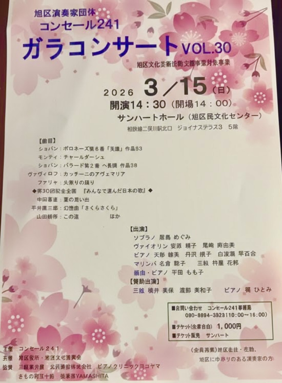「地域に根ざした音楽活動」を合言葉に、横浜市旭区在住のプロの音楽家たちによる演奏会で、ことしで30回目を迎えます。声楽(ソプラノ)、器楽(ヴァイオリン、ピアノ、マリンバ、三絃)など、独唱・独奏・アンサンブルと、多彩なプログラムで上演いたします。