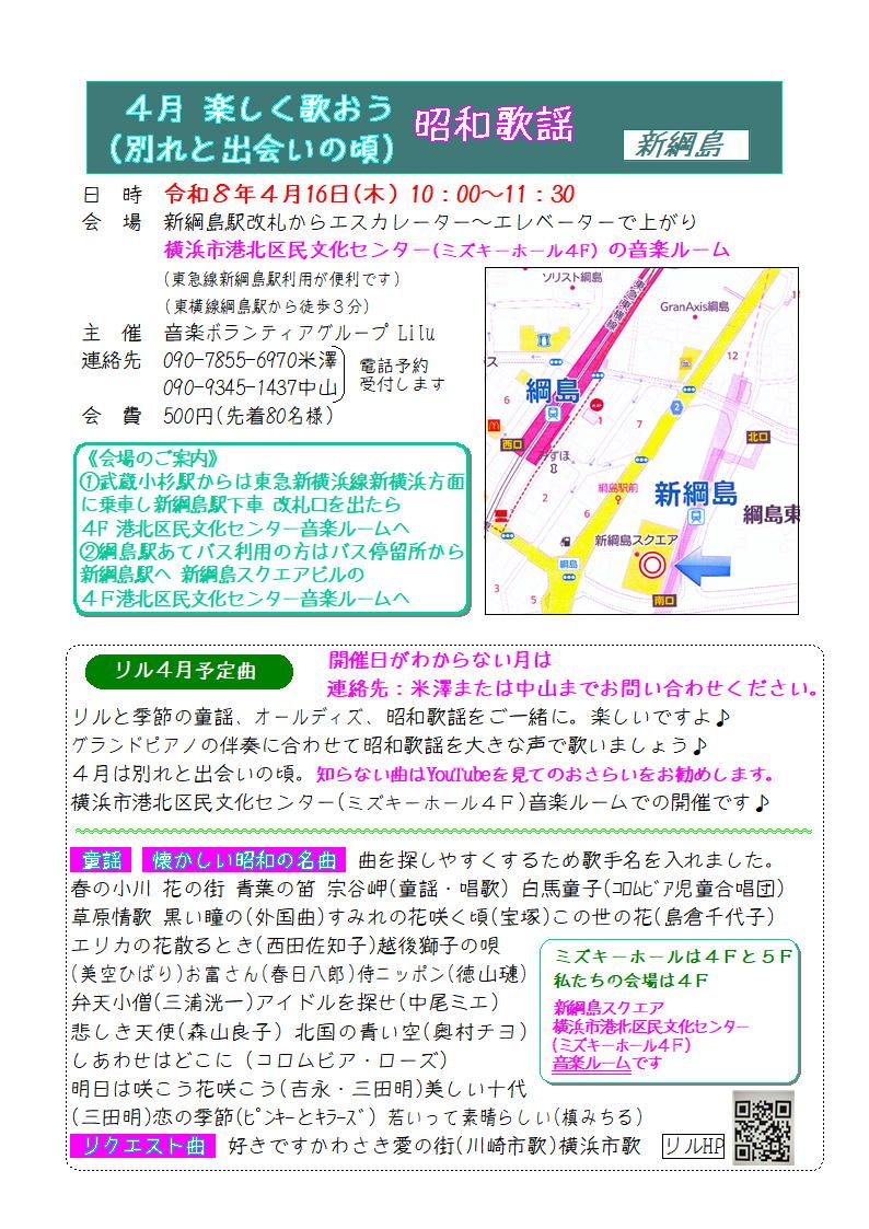 このイベントは、音楽ボランティアグループ「リル(Lilu)」が主催する、みんなで昭和歌謡や童謡を歌う集いです。