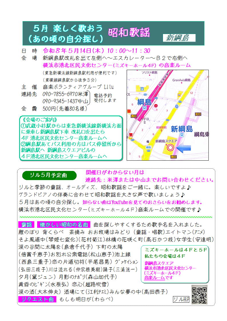このイベントは、音楽ボランティアグループ「リル(Lilu)」が主催する、みんなで昭和歌謡や童謡を歌う集いです。
